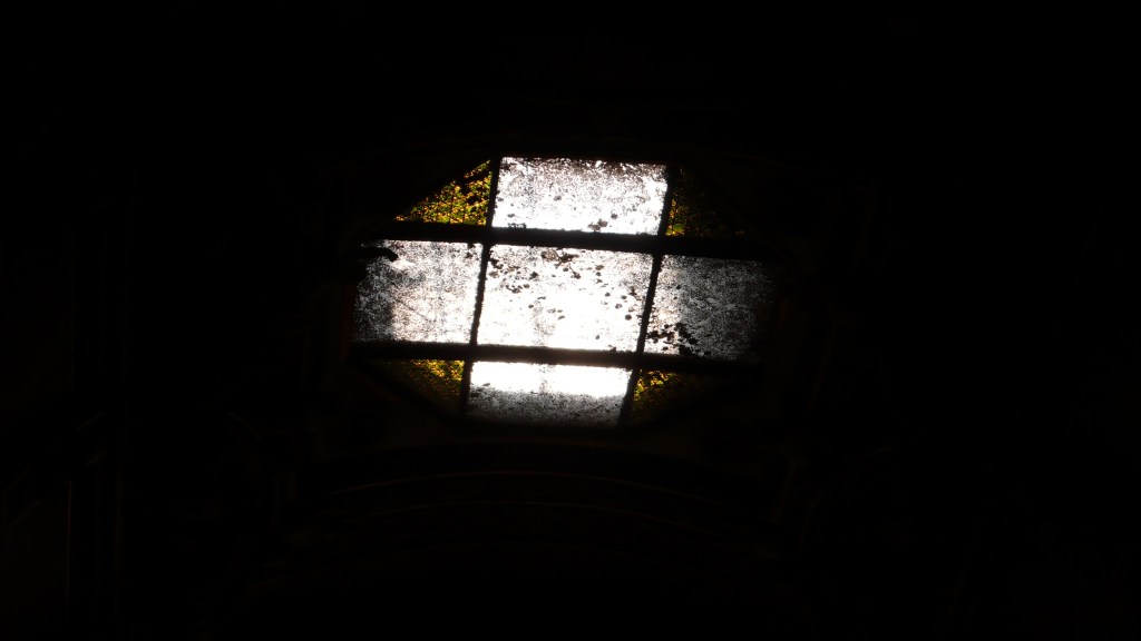 le volte gotiche attraversate dai suoni del vicino cantiere di restauro.